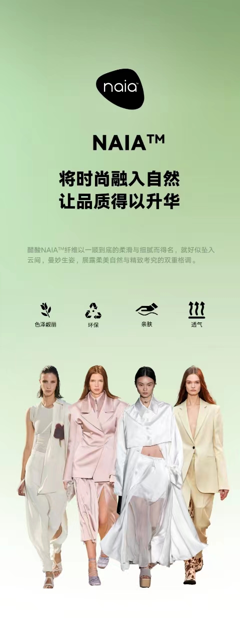 醋酸系列产品采用美国伊士曼Naia™醋酸纤维,该系列产品具有触感顺滑、色彩浓郁以及舒适且易打理的特点,同时醋酸纤维卓越的芯吸效应,能够加速水汽的传导和蒸发,可时刻保持面料持久干爽、透气不粘腻的肤感,通过差异化改性,赋予天然纤维触感,亲肤低致敏性。